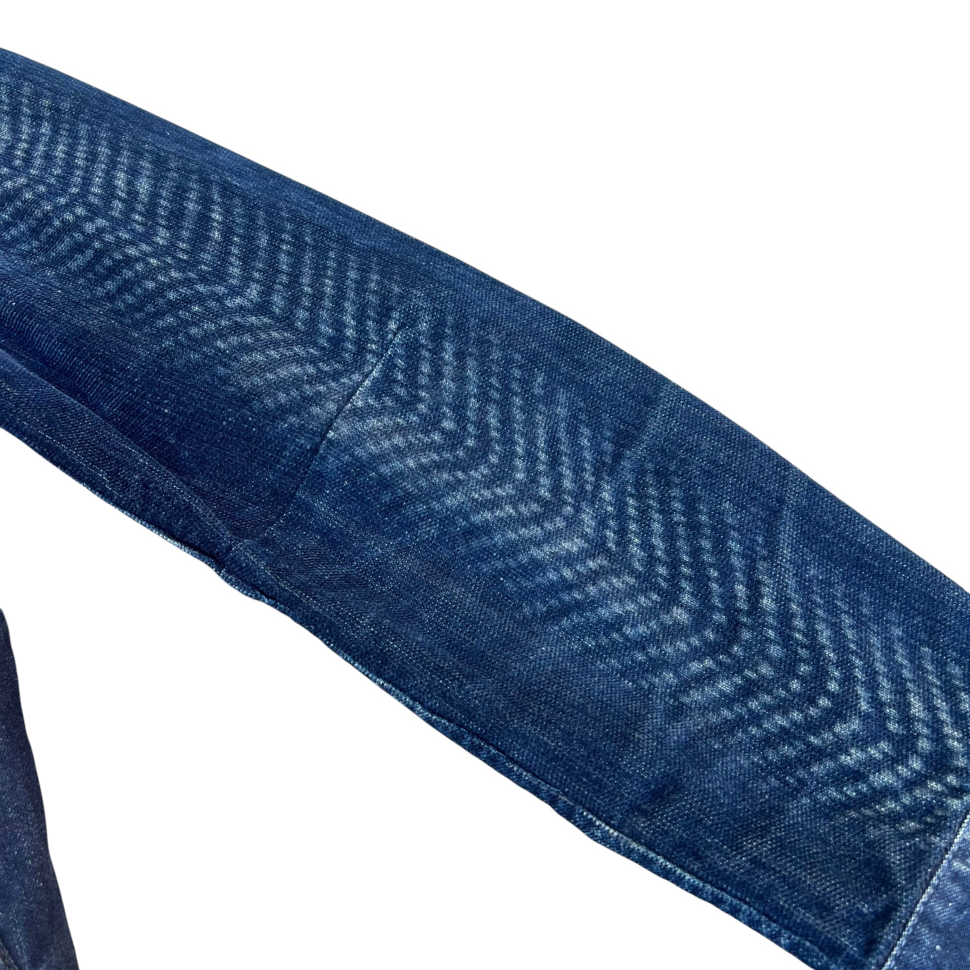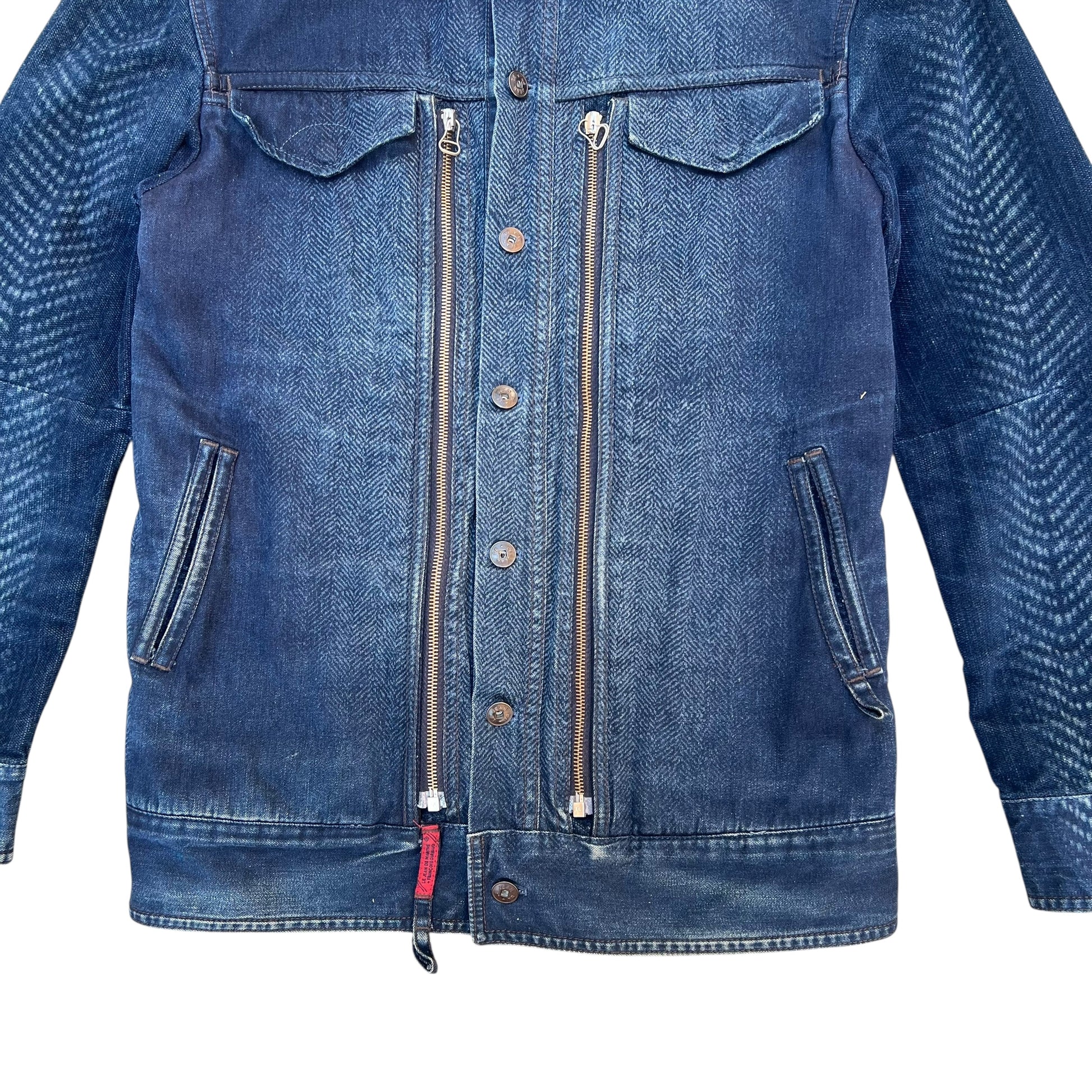 Early 2000s M+FG jacket with a double layer, a hidden zipper, and plenty of pockets. Washed denim with interesting “pshychodelic effects “/small patchwork at the back shoulder.